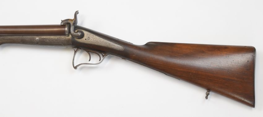 French 12 bore side by side pinfire hammer action shotgun with engraved locks, hammers, scrolling trigger guard, rotary underlever and top plate, sling suspension mounts and 28 inch Damascus barrels, overall length 111cm, serial number 105.