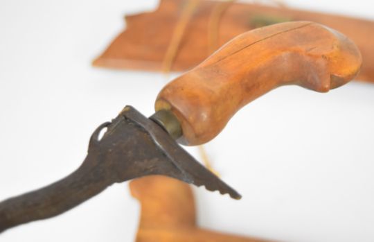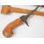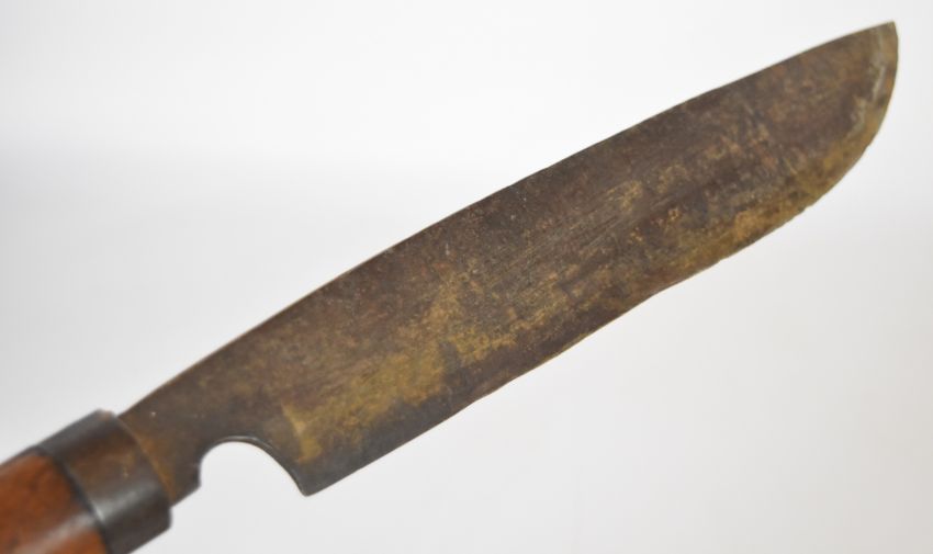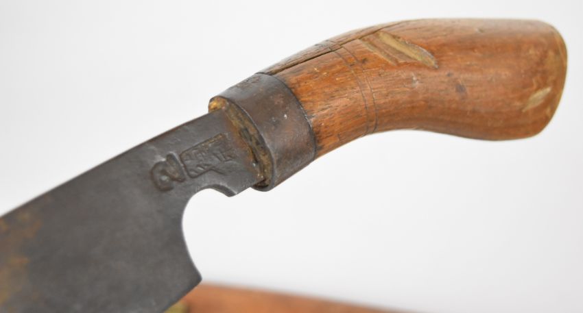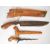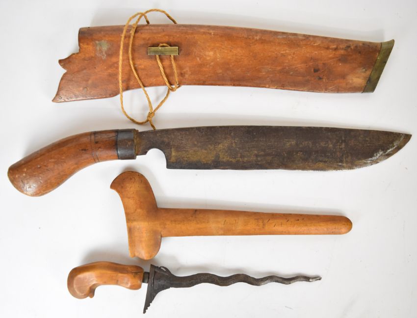 Malaysian parang knife with wooden handle, number 2 over maker's stamp to 29cm single edged blade and wooden sheath, together with a kris dagger of small scale with wooden handle and 18cm wavy edged blade, with wooden sheath. PLEASE NOTE ALL BLADED ITEMS ARE SUBJECT TO OVER 18 CHECK ON COLLECTION OR DELIVERY