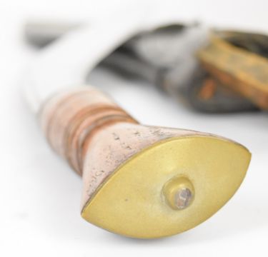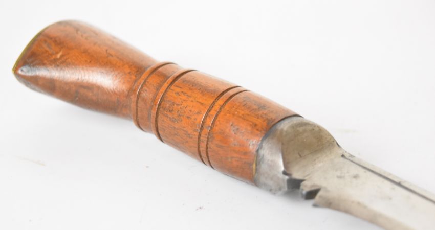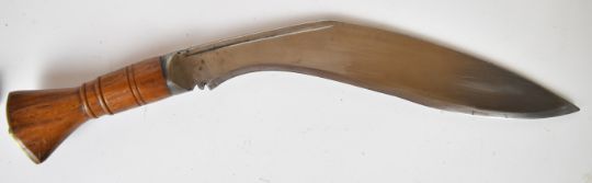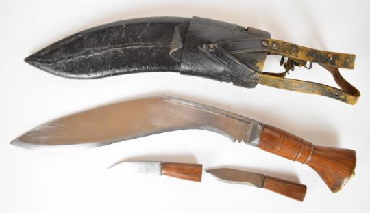WW2 era kukri knife with wooden grip, 31cm blade, leather scabbard with belt attachments and karda and chakmak. PLEASE NOTE ALL BLADED ITEMS ARE SUBJECT TO OVER 18 CHECK ON COLLECTION OR DELIVERY