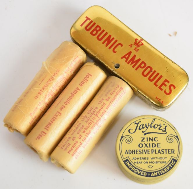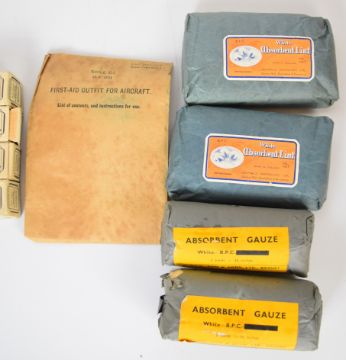 Royal Air Force WW2 'First Aid Outfit For Aircraft' canvas pouch / holdall with contents including aspirin, iodine ampules, zinc oxide, bandages etc, flap stamped A.M Curtis & Son Ltd 1941. Please note medical contents are not suitable for use