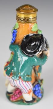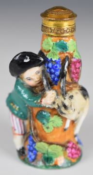 19thC porcelain figural scent / perfume bottle with goat, fruit and vine decoration in relief, probably Spode / Copeland, height 6.5cm