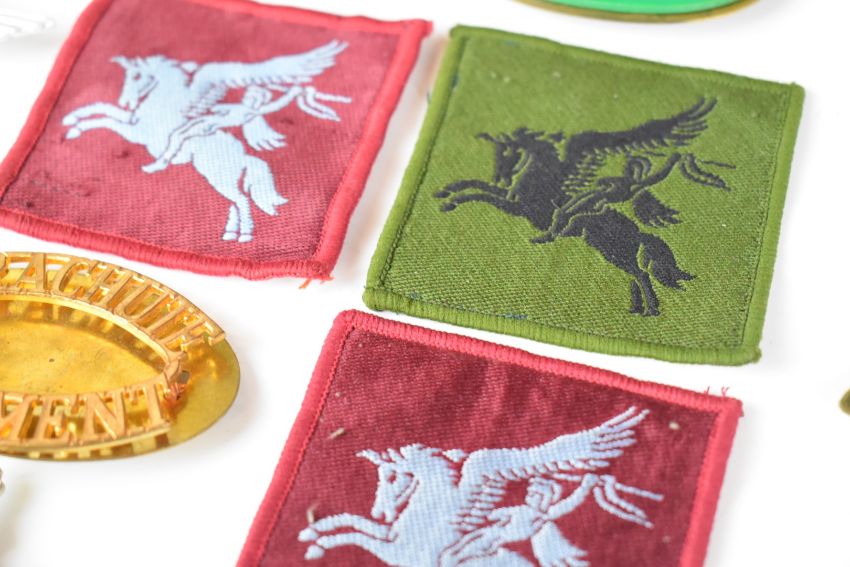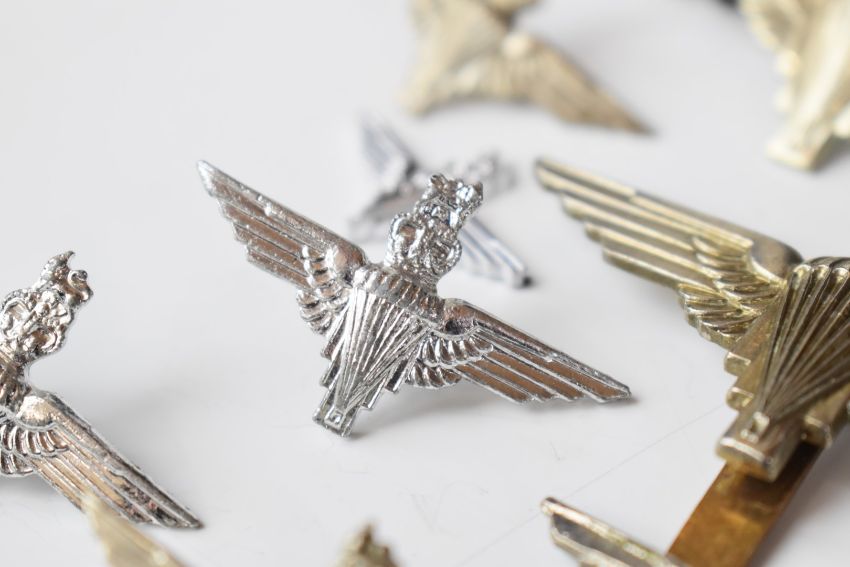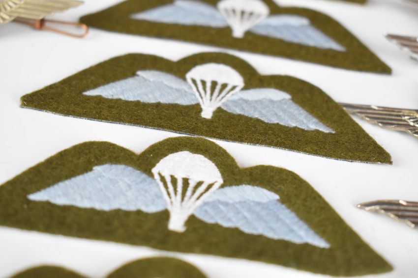 Twenty four British Army Parachute Regiment cap badges, two with J R Gaunt to slider, one by London Badge & Button Co etc, some restrikes, together with cloth insignia qualification badge