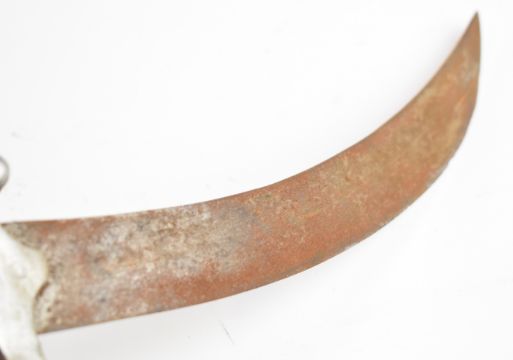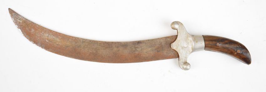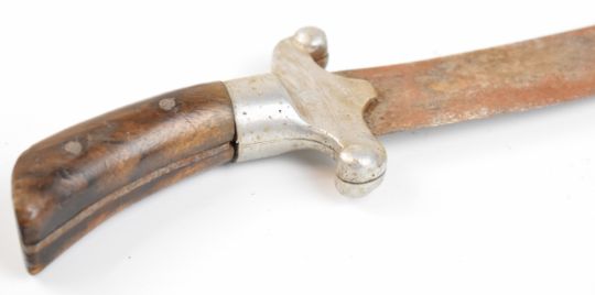 Eastern knife with alloy crosspiece, 25cm curved blade and leather sheath. PLEASE NOTE ALL BLADED ITEMS ARE SUBJECT TO OVER 18 CHECK ON COLLECTION OR DELIVERY