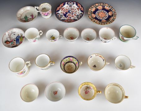 Collection of 19thC Coalport, Ridgway, New Hall, Derby, Meissen and other teacups, bowls, saucers and plates including Derby Imari, Wemyss ware Bon Jour cup, some with Worlock Collection label to base