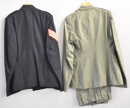 Two Royal Marines uniforms comprising No 1 dress and Lovats, both with associated badges