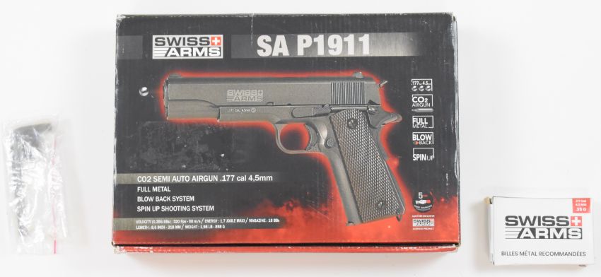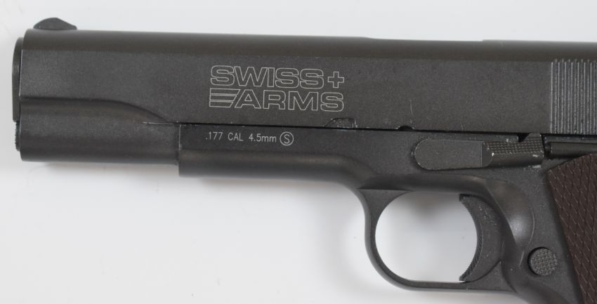 Swiss Arms SA P1911 .177 COair pistol with chequered faux wooden grips, multi-shot magazine and fixed sights, serial number 2128806, in original box with accessories.