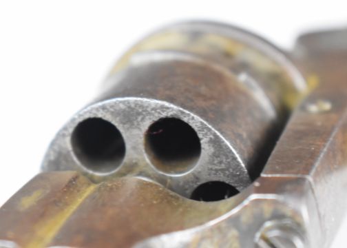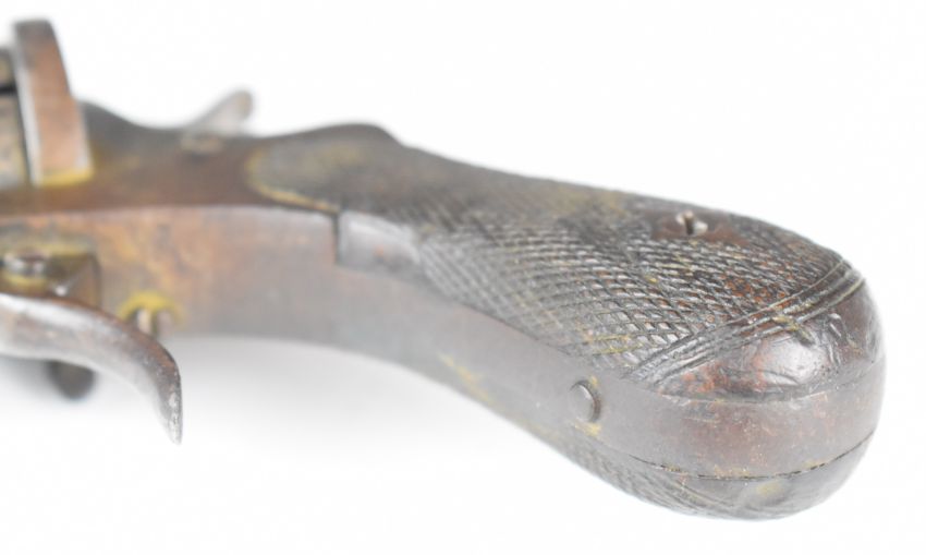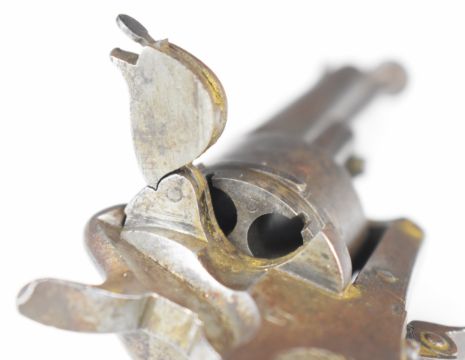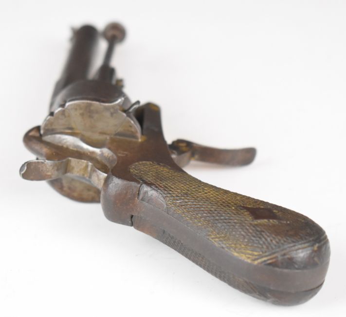 Belgian six-shot pinfire self-cocking revolver with chequered wooden grips, folding trigger and 3.5 inch part-octagonal barrel, overall length 20cm.