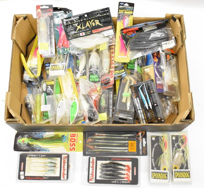 Approximately 50 sea / pike fishing lures, soft plastics, jigs etc including Spoondog, Savage, Stanley, Dexter etc