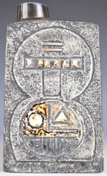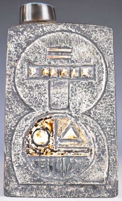 Troika pottery chimney vase with carved and incised decoration, brown glaze, Troika England and AD monogram to base, height 20cm