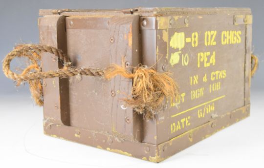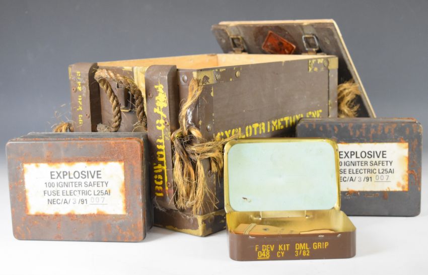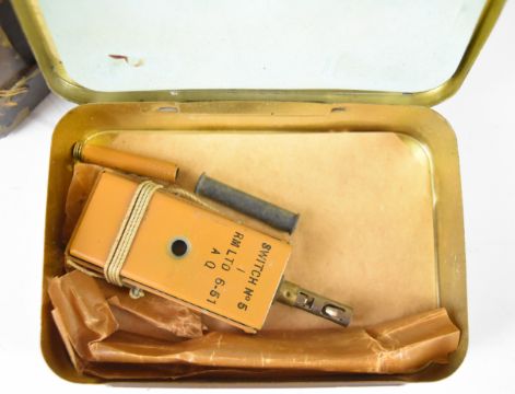 British Army wooden explosives box for 8oz charges, together with three smaller tins and a No 5 switch