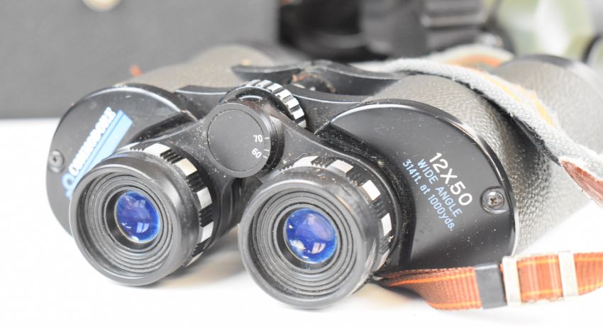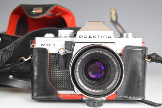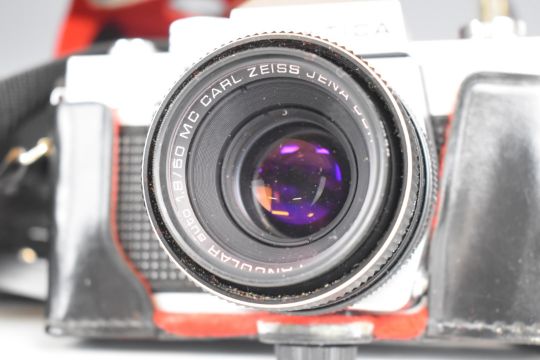 Cameras, binoculars and spotting scope to include Opticron Piccolo 60mm, Commodore 12x50 binoculars, Praktica MTL3 35mm SLR with Carl Zeiss Jena 1.8/50 lens, Halina Paulette Electric and a Nikon Coolpix 2000