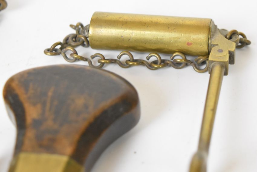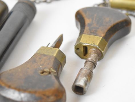 Twelve gun tools and accessories including a campaign or travelling gun key with nipple key and pricker, James Dixon & Sons and similar shotgun cartridge extractors, bore scopes, oil bottles, Hillas's Exra Refined Rangoon Oil etc.