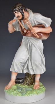 Two Zsolnay Pecs figures comprising a piper and a man with a dog, tallest 42cm