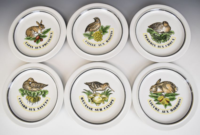 Porcelaine D Auteuil, Paris, France six plates decorated in with birds and animals