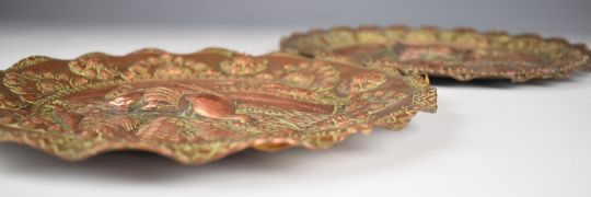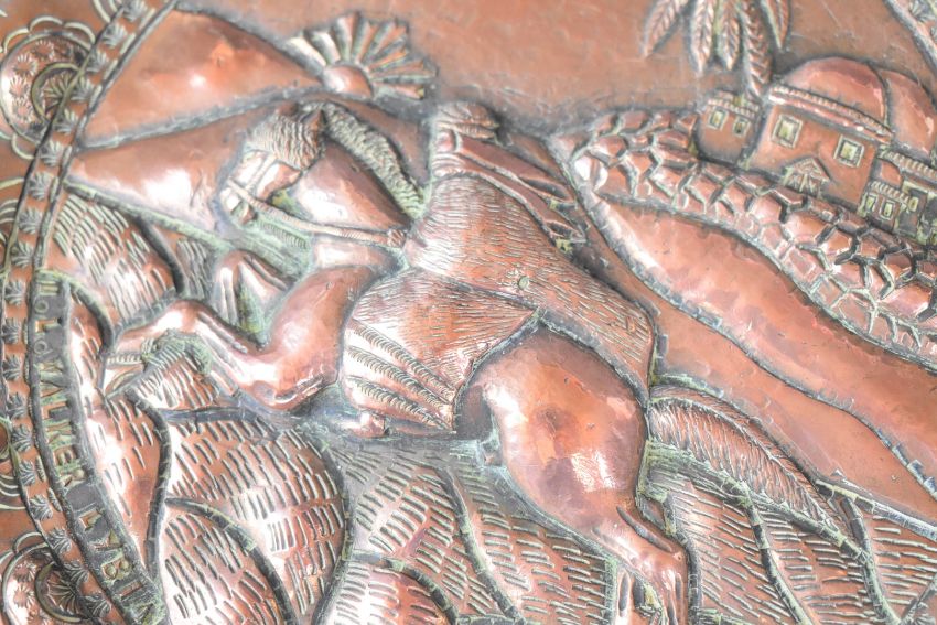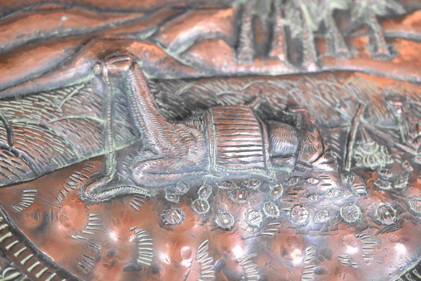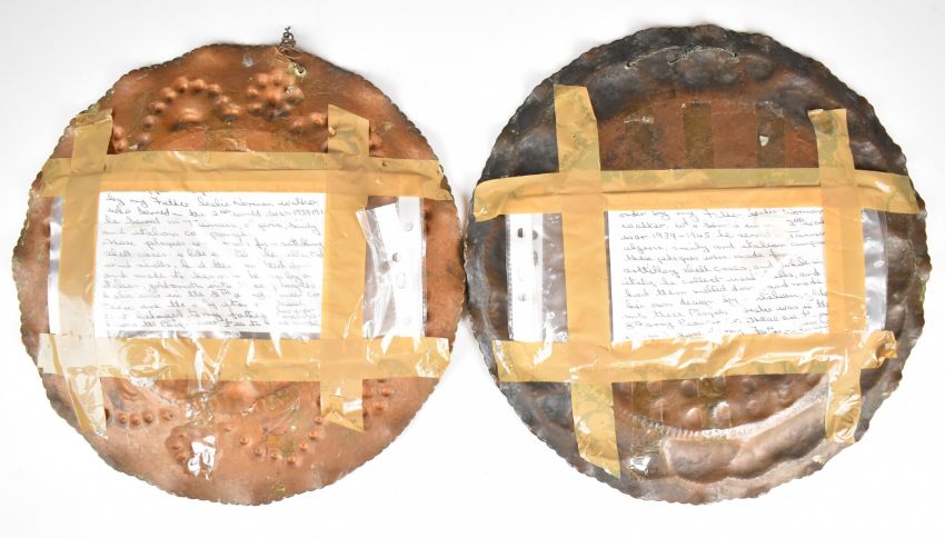 WW2 North Africa campaign interest pair of copper trench art wall plates, one depicting a camel with desert scene beyond, the other with an Arab or similar riding a horse with buildings beyond, names to lower left N. L. Walker Libya, with provenance verso; Leslie Norman Walker served in the 8th Army Pioneer Corps and commissioned an Italian gold and silversmith to make these for him, diameter 28cm