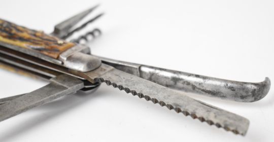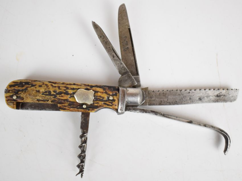 George Wolstenholm, Sheffield I.XL coachman's pocket knife with seven blades / attachments, stag horn grips and vacant cartouche, longest blade 8cm. PLEASE NOTE ALL BLADED ITEMS ARE SUBJECT TO OVER 18 CHECK ON COLLECTION OR DELIVERY