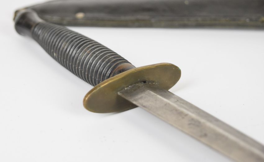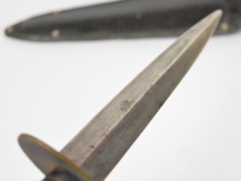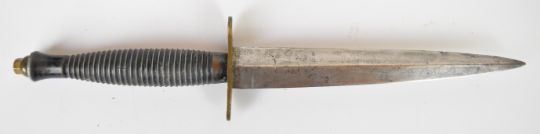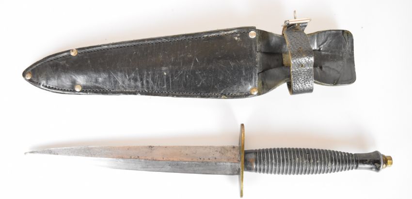 Fairburn Sykes pattern fighting knife 17cm double edged blade with leather sheath. PLEASE NOTE ALL BLADED ITEMS ARE SUBJECT TO OVER 18 CHECK ON COLLECTION OR DELIVERY