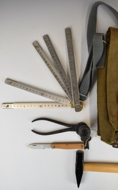 German explosives haversack with contents including cable connectors, hammer, metal ruler, pliers, stripping knife etc