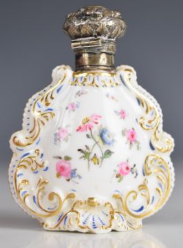19thC porcelain scent / perfume bottle, possibly Spode, with Geoffrey Fisk Collection label to base, height 8cm