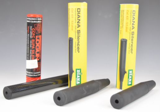 Three air rifle sound moderators comprising two Diana and one Logun, all in original tubes.