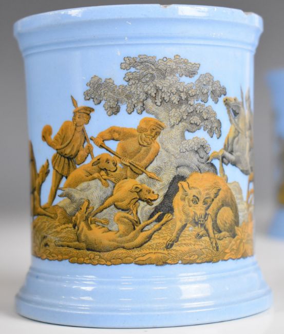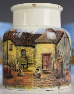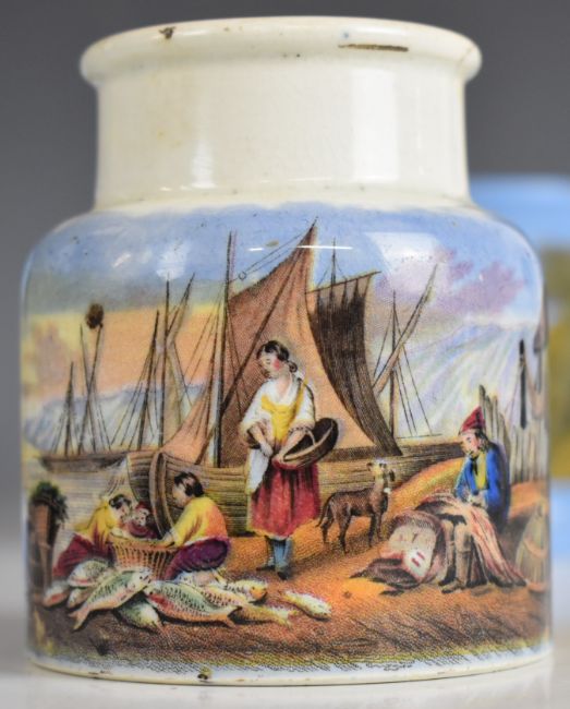 Prattware pot decorated with fisherwomen and two cache pots, tallest 12cm