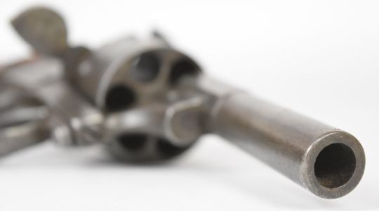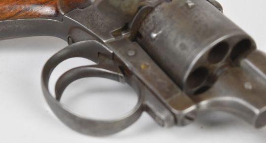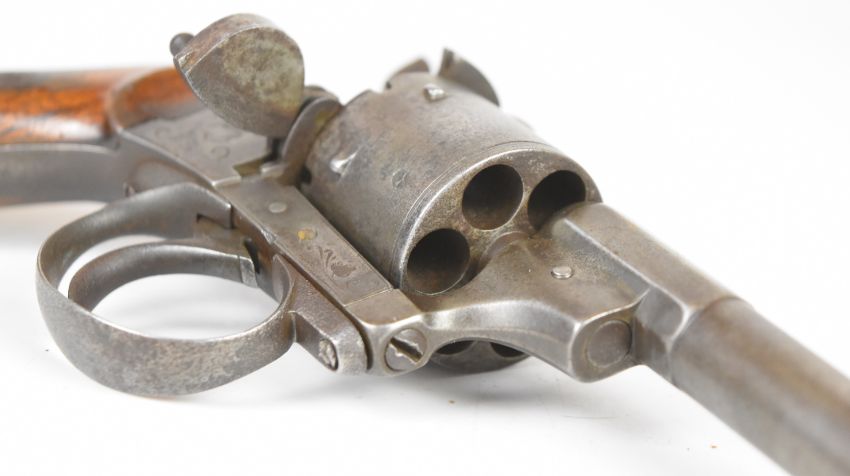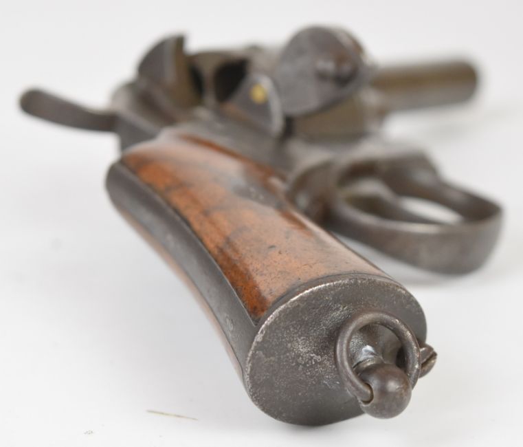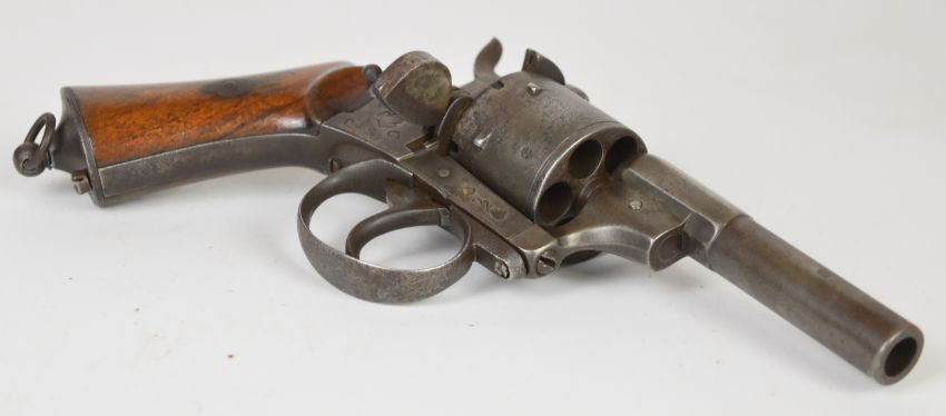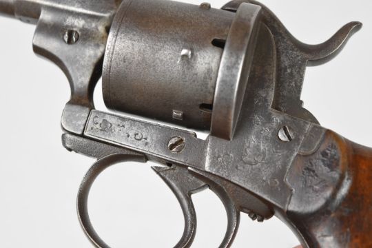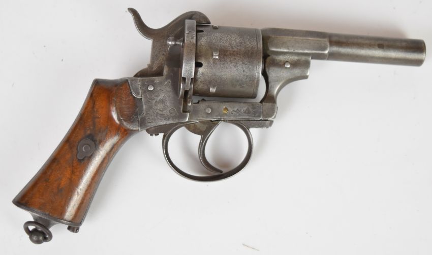 Belgian six-shot pinfire double-action revolver with shaped wooden grips, belt loop and 3.25 inch part-octagonal smooth bore barrel, overall length 21.5cm.