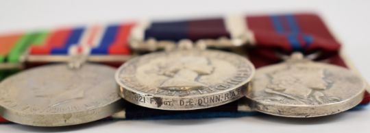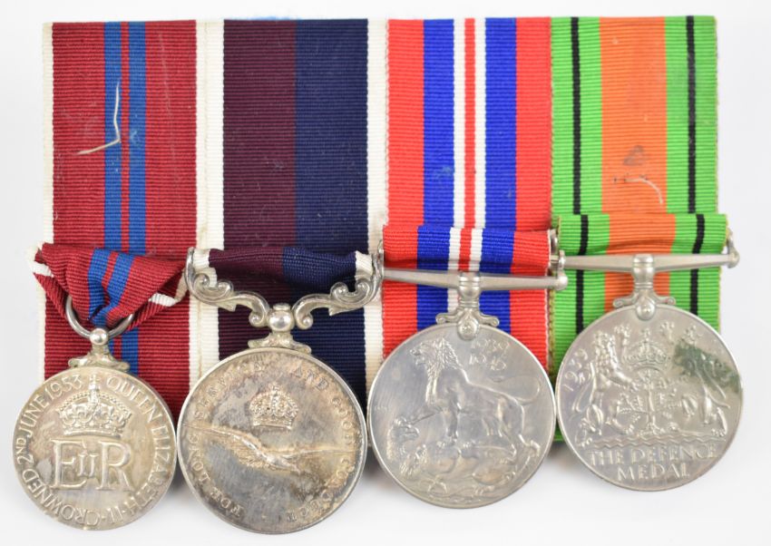 Royal Air Force Long Service Medal named to 4637821 F.Sgt D.E. Dunn, R.A.F with Defence Medal, War Medal and 1953 Coronation Medal. David Elisha Dunn was born in West Bromwich, 14 August 1907. Coronation Medal confirmed, Flight Sergeant, Spitalgate. He died in Highnam, Gloucestershire 4 April 1995.