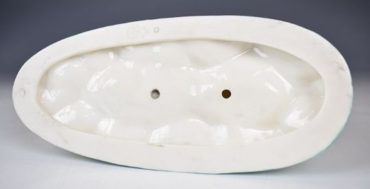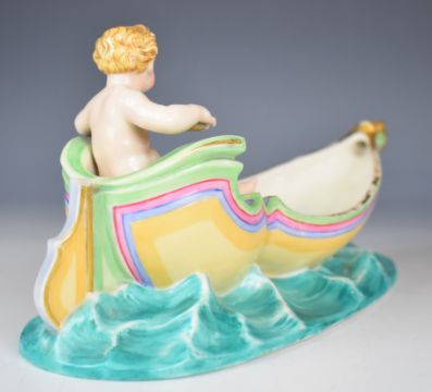 Royal Worcester majolica figural sweetmeat dish modelled as a boat with putti at the tiller, with damage/loss, height 13 x length 28cm