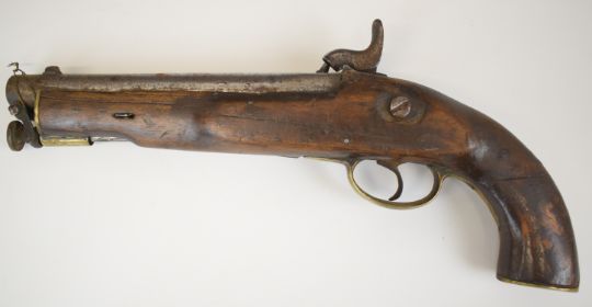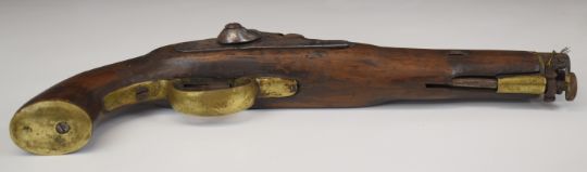 Sea Service or Coastguard percussion hammer action pistol with brass trigger guard, butt plate and mounts, captive ram-rod and 8 inch smooth bored barrel, overall length 37cm.