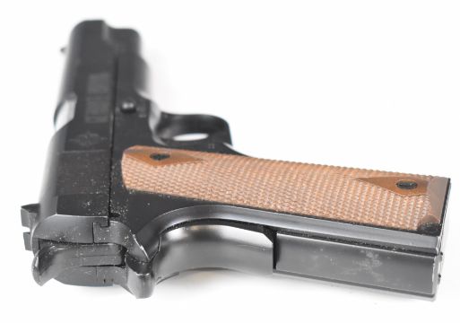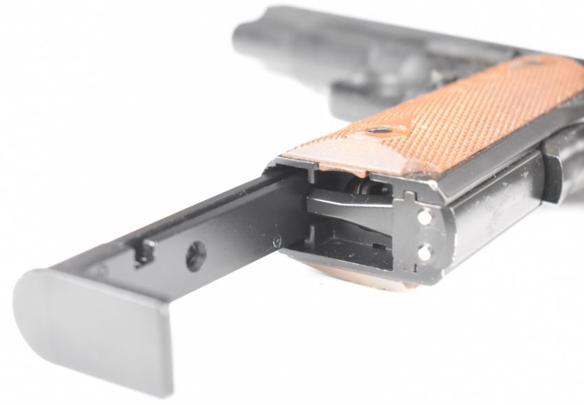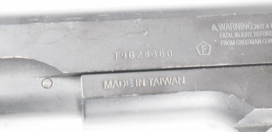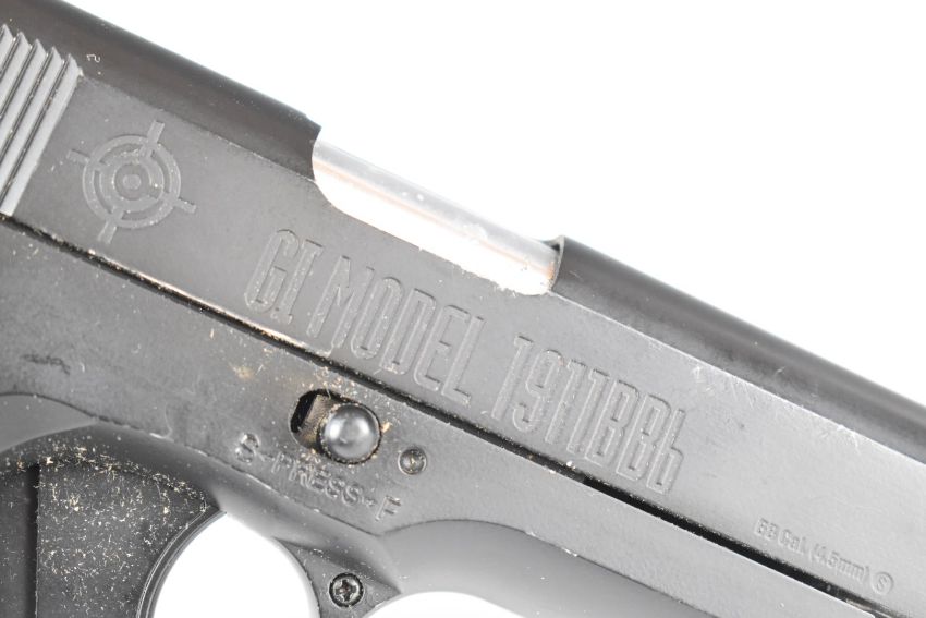 Crosman GI Model 1911 BBb .177 COair pistol with chequered grips, multi-shot magazine and fixed sights, serial number 19G28360, in hard carry case.