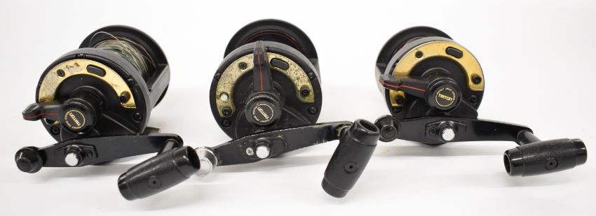 Five Shimano multiplier fishing reels comprising two TLD 5, two TLD 15 and a boxed TLD two speed 20A, possibly unused but loaded with braid