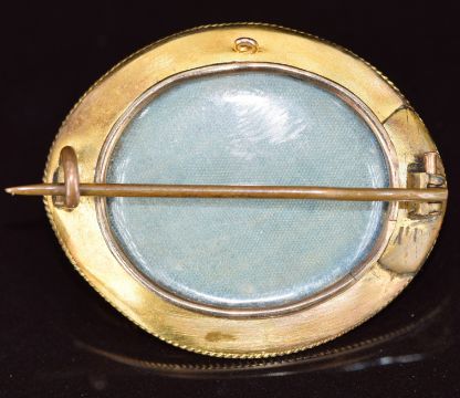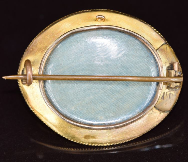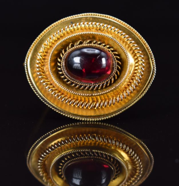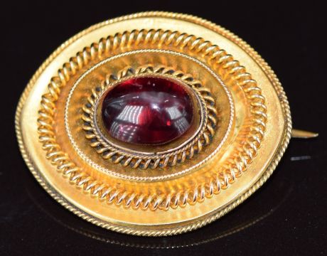 Victorian 9ct gold brooch set with a foiled garnet, verso a glass compartment, 7.9g, 3 x 2.5cm