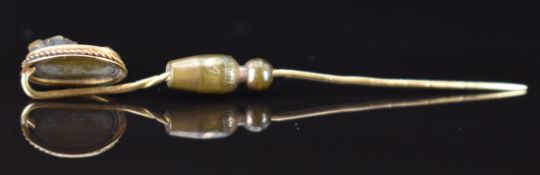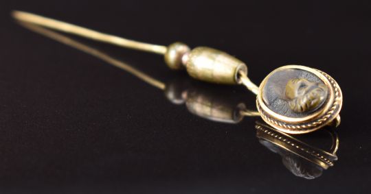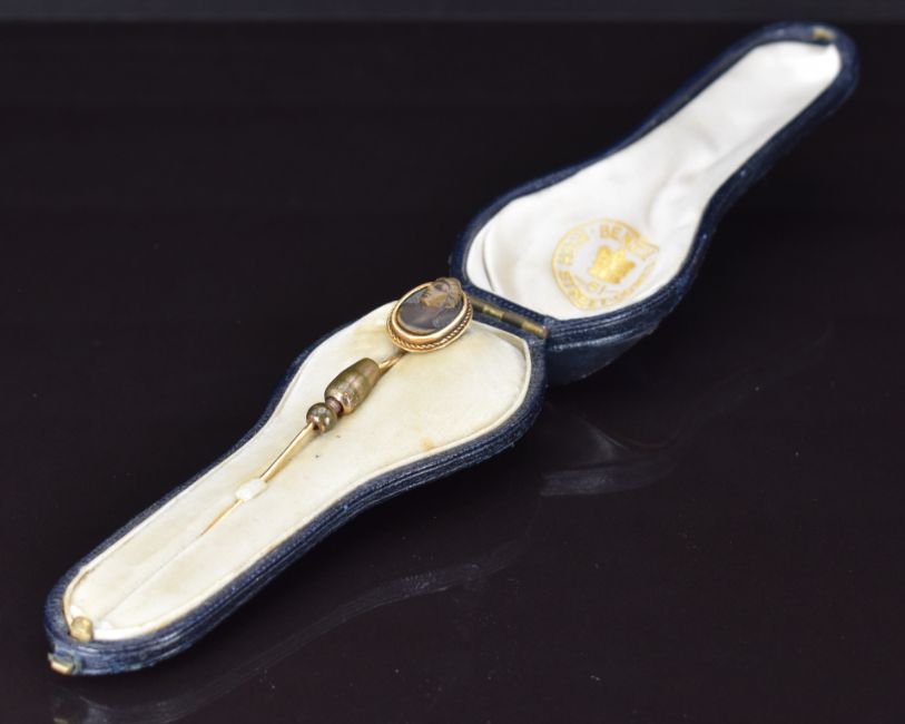Victorian yellow metal stick pin set with a lava cameo, in antique box