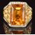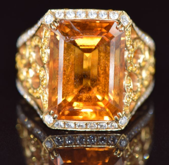 An 18k gold ring set with an emerald cut citrine of approximately 10ct with diamonds and yellow topaz to the shoulders and shank, size L, 17.7g