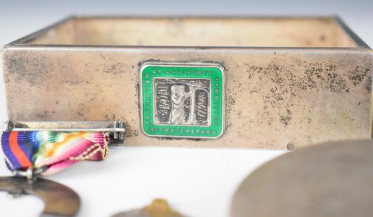 South African silver cigarette box base marked STG SAM, length 11.5cm, pair of hallmarked silver dressing table pot lids, further hallmarked silver lid, bangle strap marked sil and a hallmarked silver 1913 swimming medal, weight of all items 250g together with a hallmarked silver mounted miniature book and a hallmarked silver medal on ribbon