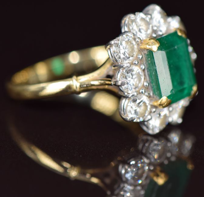 An 18ct gold ring set with an emerald cut emerald of approximately 2.3ct surrounded by ten round cut diamonds of approximately 0.15ct each, 5.8g, size O/P