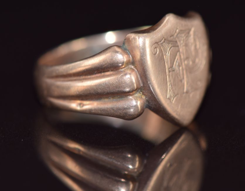 A c1910 9ct rose gold signet ring of shield shape, 5.8g, size P