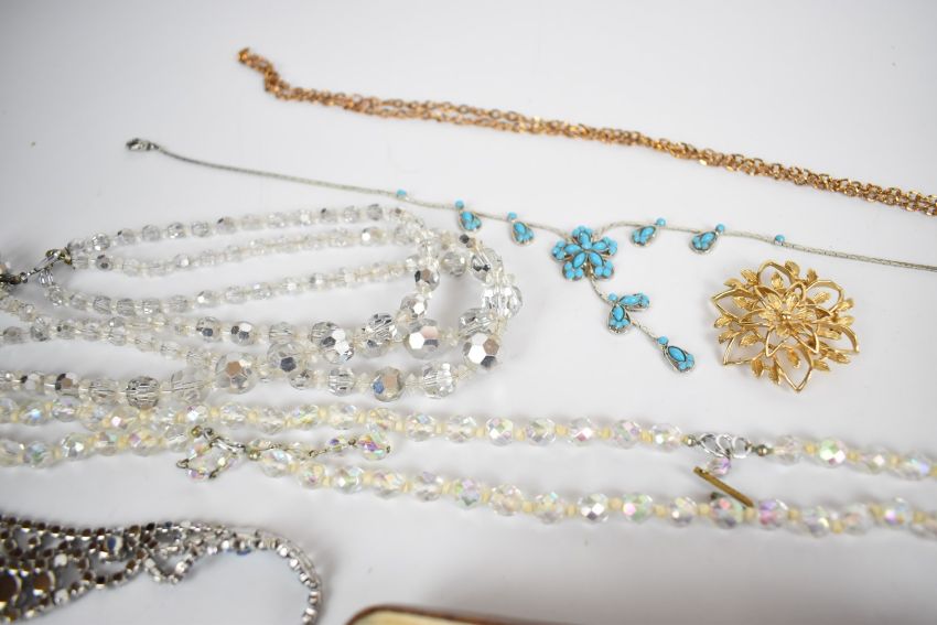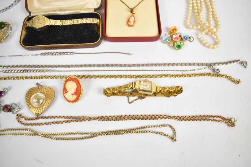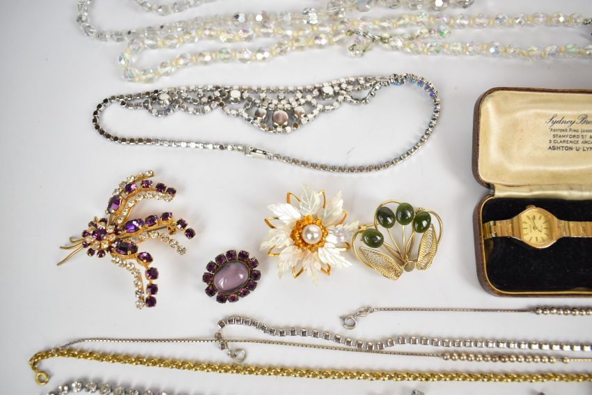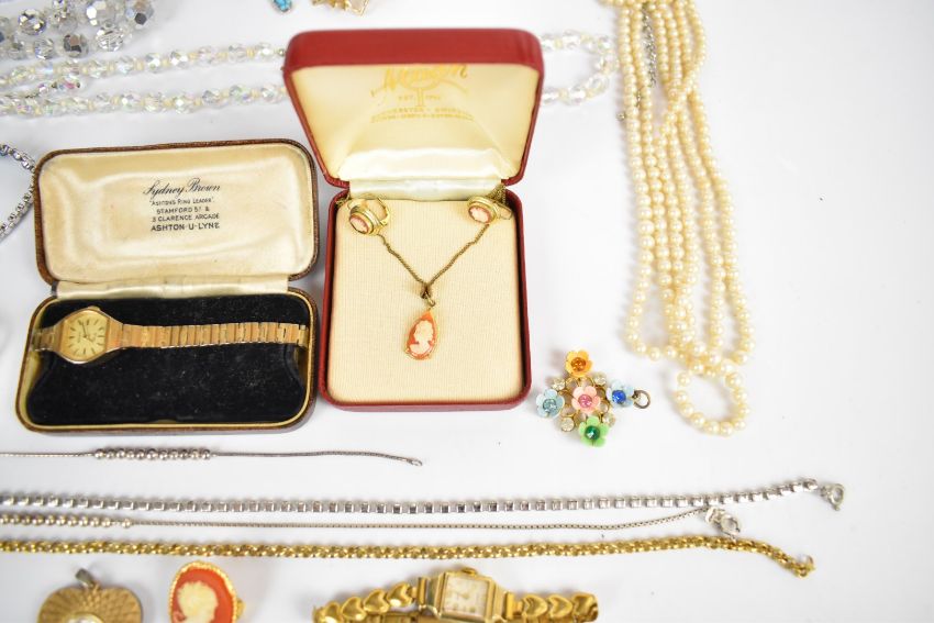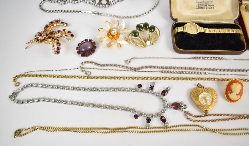 Costume jewellery including Sarah Coventry brooch, diamanté necklaces, cameo earrings and pendant, vintage brooches, rolled gold chain, silver necklace and matching bracelet, etc