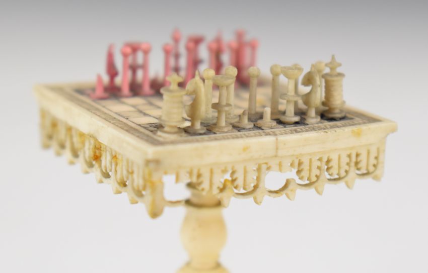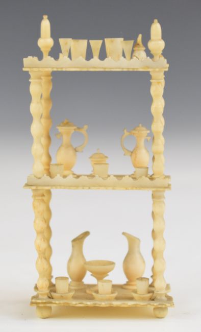 19th century carved bone possibly prisoner of war doll's house chess table with pieces together with a wot not and contents, height of taller 8.5cm