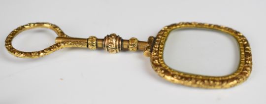 Two pairs of folding lorgnettes comprising a pair of mother of pearl handled examples and a pair of silver framed Art Deco examples, together with two magnifiers, one with Pinchbeck or similar frame, the other 9ct gold, length of longest when retracted 17cm