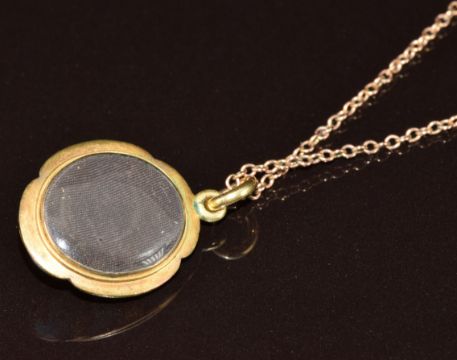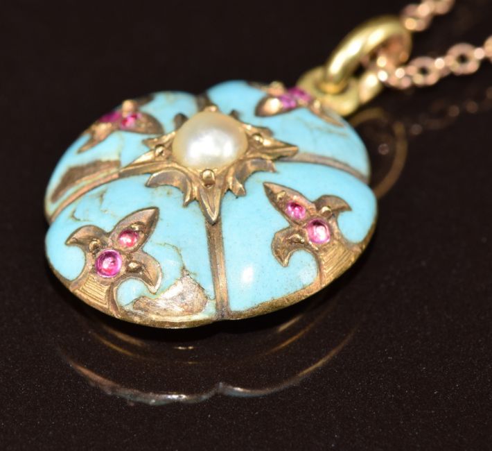 Victorian locket / pendant set with aqua enamel, a split pearl and rubies, verso a locket compartment, 2.5 x1.8cm, on 9ct gold chain, 45cm