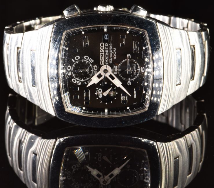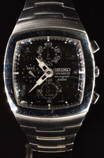 Seiko Premier gentleman's chronograph wristwatch ref. 7T62-0BG0 with date aperture, steel hands and Arabic numerals, black dial, stainless steel case and signed calibre 7T62 movement, on stainless steel bracelet, case diameter 38mm, serial number 274421.