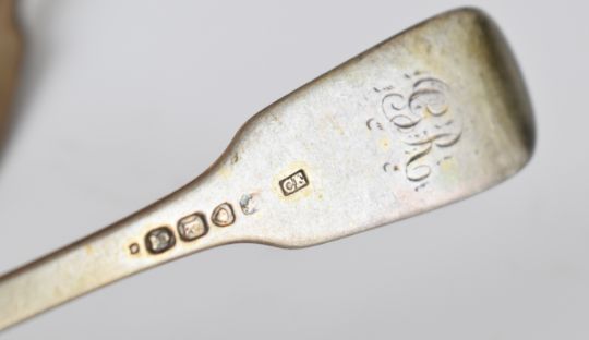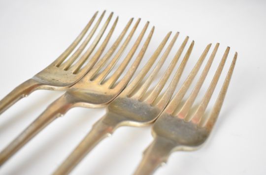 Set of four Georgian hallmarked silver Fiddle pattern table forks, London 1825, maker Charles Eley, length 20cm, weight 271g