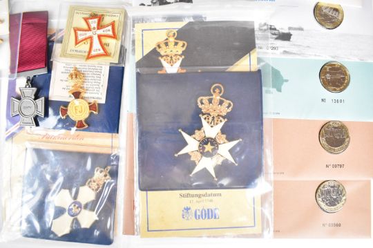 Twelve wartime related commemorative £2 presentation packs, together with a collection of sixteen Göde reproduction war medals, mostly in packs