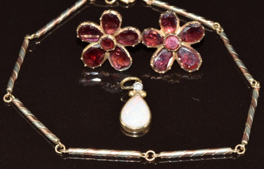 A pair of Victorian earrings set with foiled garnets in a floral cluster (4g, 16.5mm), 9ct gold bi-coloured bracelet (3.2g, 18cm) and 9ct gold pendant set with a diamond and pear cut opal (0.8g, 14mm)