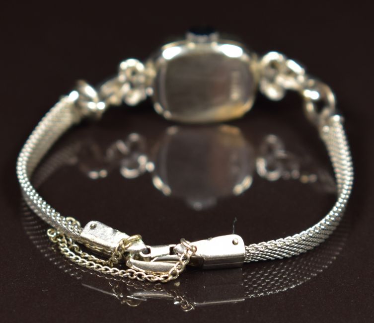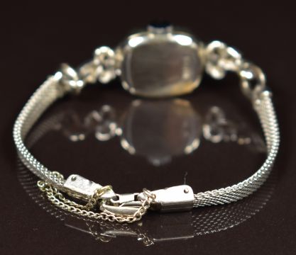 Wittnauer 14ct white gold ladies wristwatch with diamonds set to the bow shaped case lugs, silver hands, hour markers and dial and mechanical movement, on white metal bracelet, case diameter 15mm.