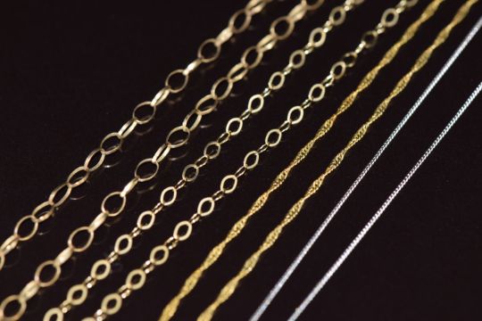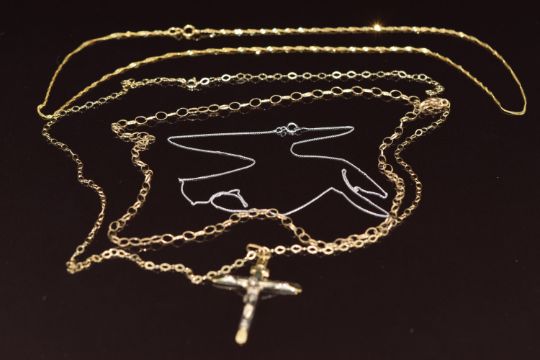 Three 9ct gold chains, a 9ct white gold chain and a 9ct gold crucifix, 5.2g