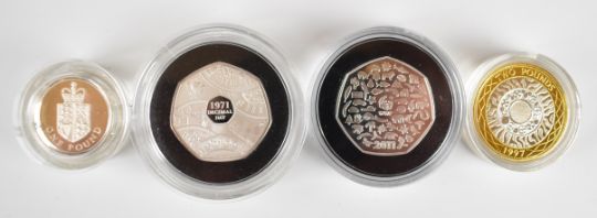 Four various cased Royal Mint silver proof coins comprising 2011 WWF 50p, 2021 Decimal Day 50p, 1997 £2 and 1988 £1, with certificates