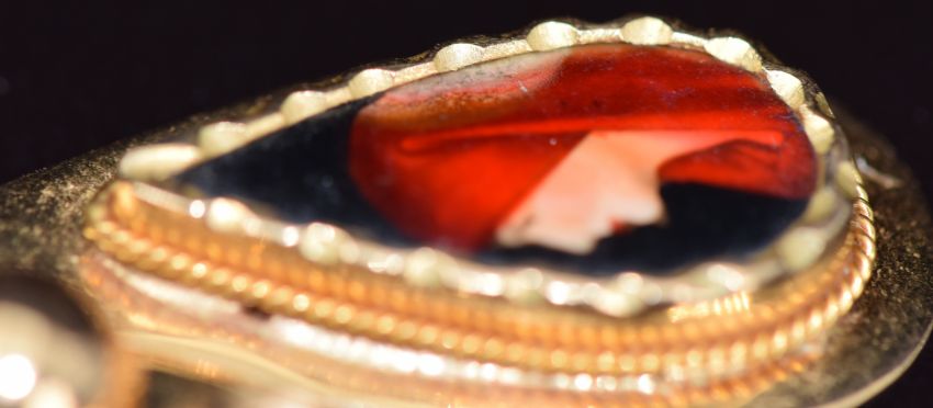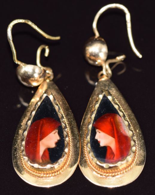 A pair of c1900 yellow metal earrings set with enamel portraits, 9g, 5cm