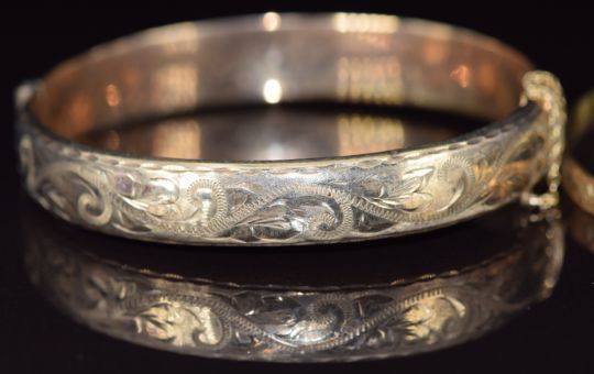 A 9ct gold bangle with engraved decoration (12.5g) and a rolled gold bangle
